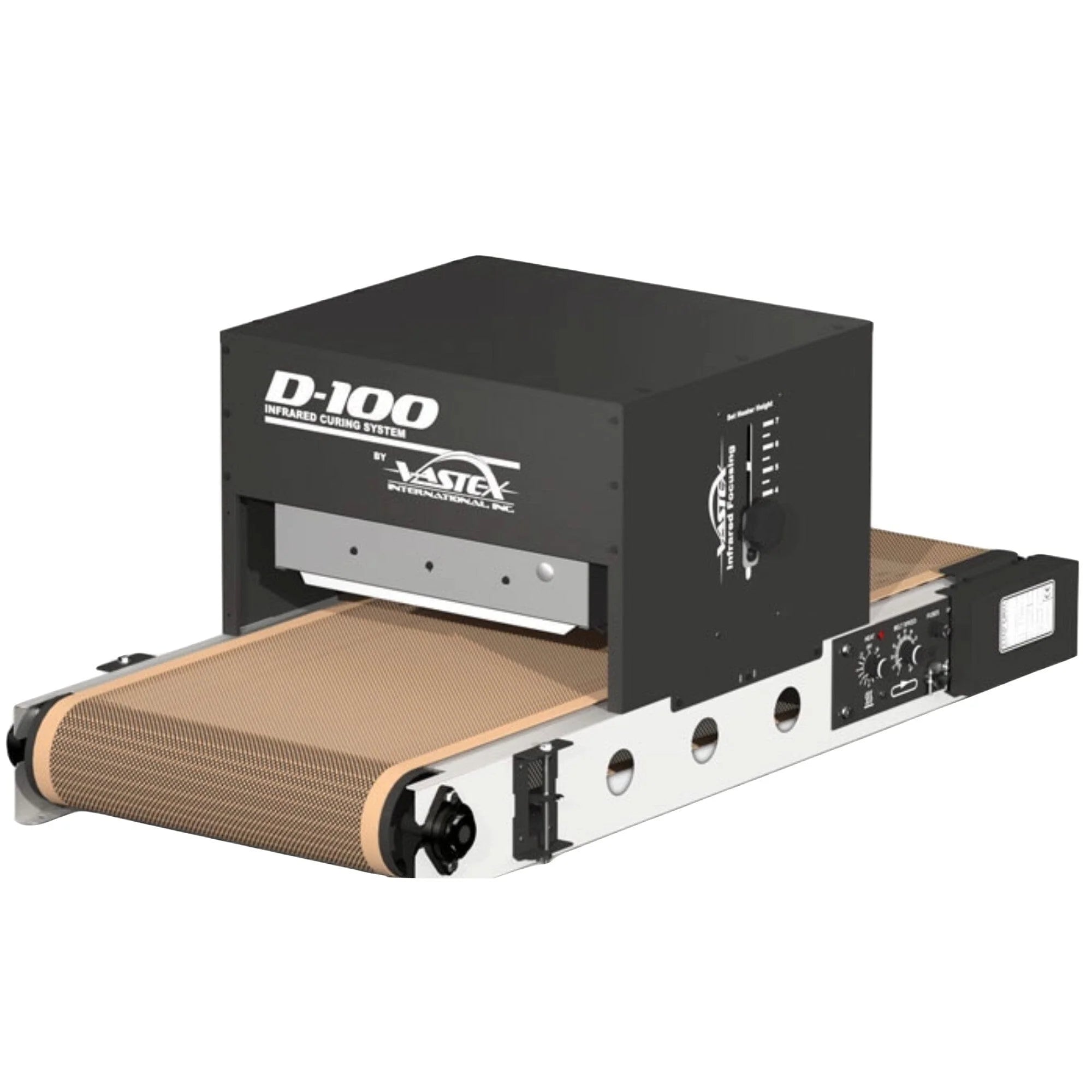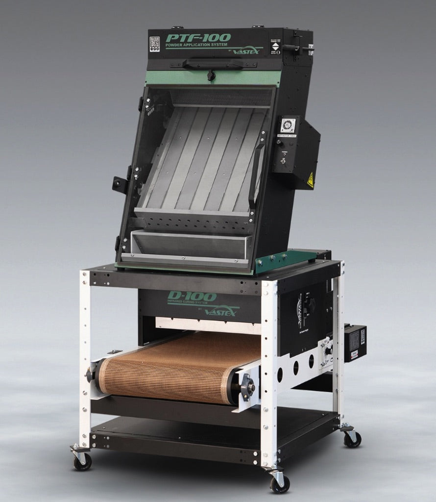 The Vastex PTF-Combo 100 and D-100 conveyor dryer streamline DTF film production by applying and curing adhesive powder in just 10 square feet.