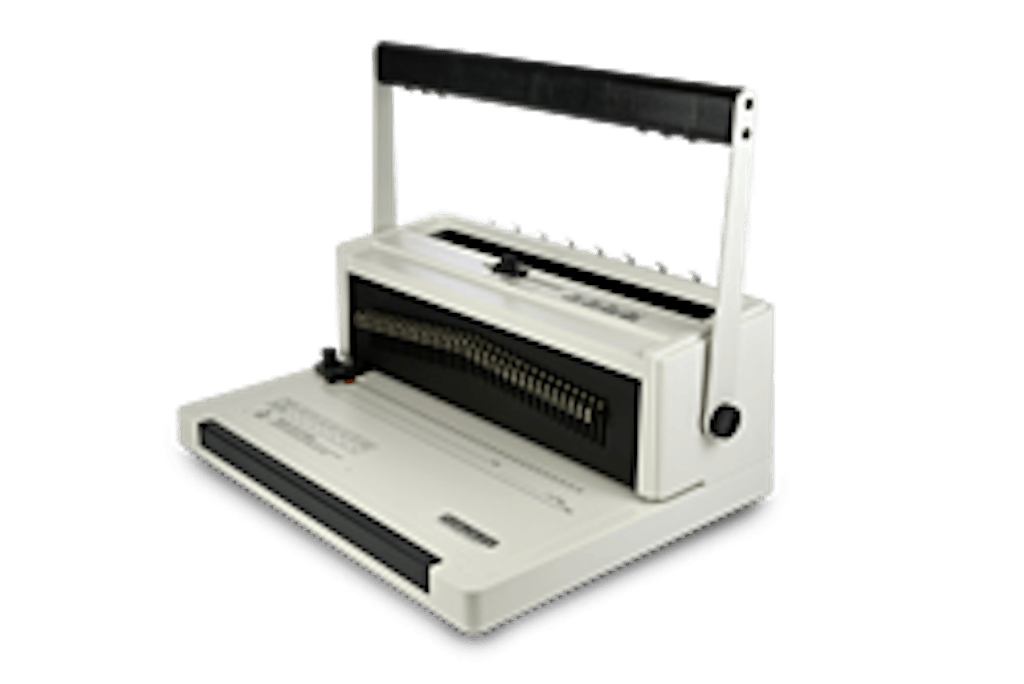 This wiro binding machine utilizes 3:1 pitch twin-loop wire-o binding spines up to 9/16 in. in diameter and binds documents up to