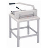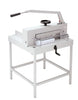 Manual guillotine with spindle guided clamp and backgauge positioning by using a hand crank.
