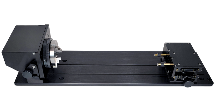 The chucks on the ends hold cylindrical objects and rotate during the engraving process.